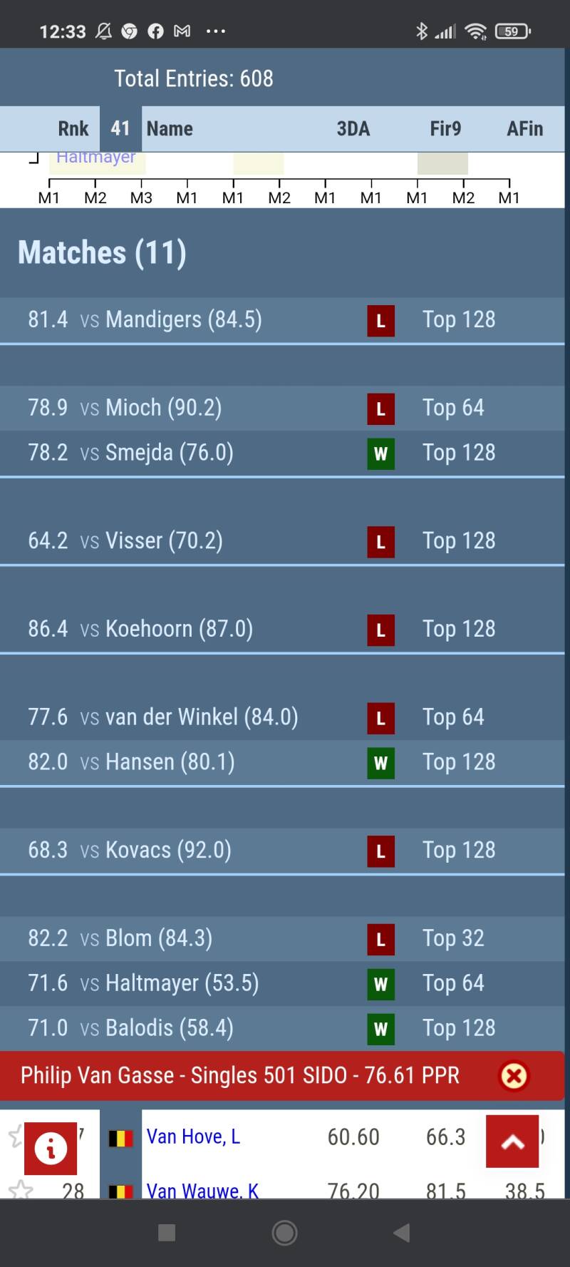 Philip Van Gasse kon de Nederlander Willem Mandigers niet opzij zetten , hij miste in de 5de en 8ste leg die oh zo belangrijke dubbel om Willem bij te benen en de Nederlander maakte die foutjes ongenadig af. Philip verloor de partij met 6-3.