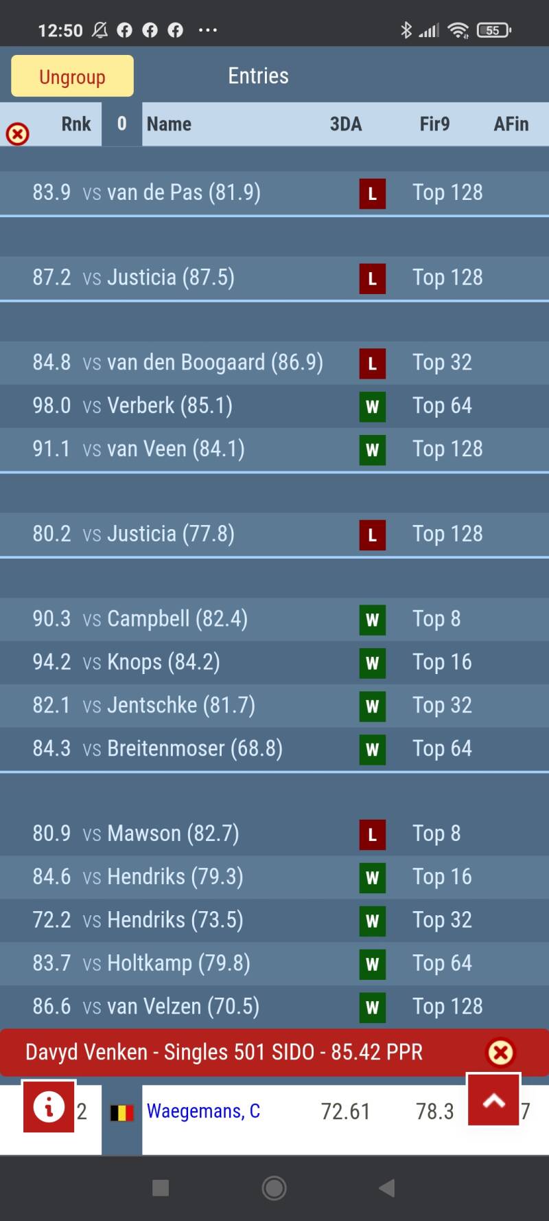 Davyd Venken verliest nipt van de Nederlander Benito van de Pas . Na een 4-1 en 5-2 achterstand wist de Davyd toch terug te knokken en met 3 legs na elkaar te pakken toch een beslissende leg uit de brand te slepen , daar kwam Davyd iets te laat met een maximum score om de Nederlander het moeilijk te maken en verliest de partij met 5-6 .