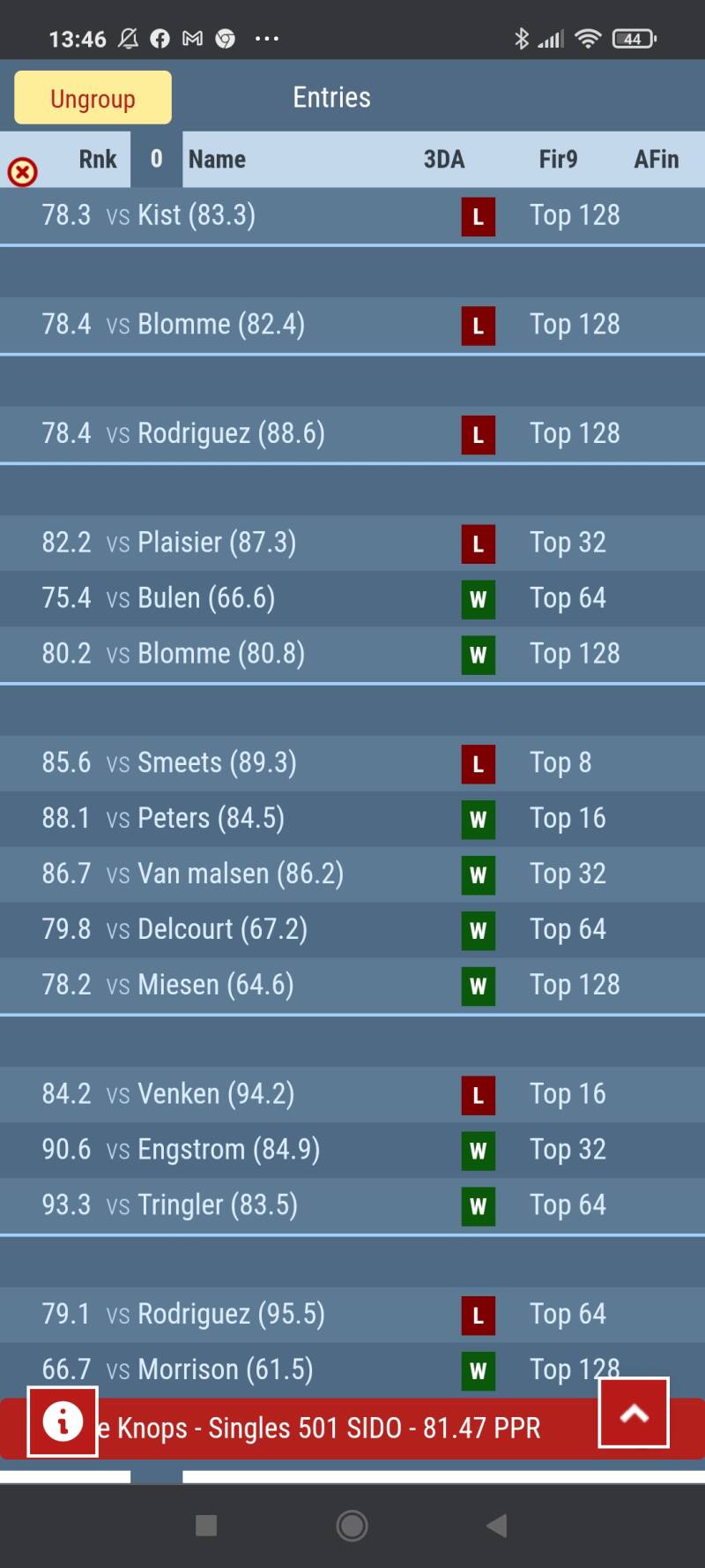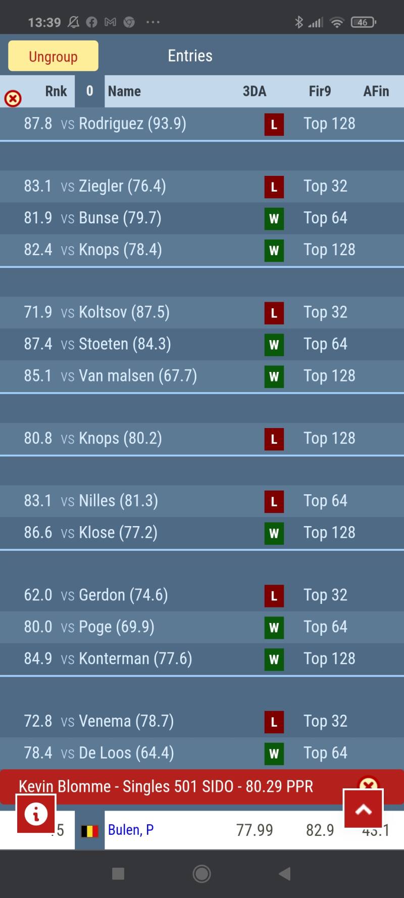 Kevin Blomme had een serieuze kluif aan het Oostenrijks Toptalent Rusty-Jake Rodriguez. Rusty-Jake toonde al zijn vorm de afgelopen week en ook Kevin mocht dit ondervinden in de eerste leg werd zijn gemiste dubbel afgestraft een 104 checkout en leek af te Steven op een complete whitewash maar kon in de 6de leg toch tegenprikken in de 7de leg mist hij de 170 checkout en maakt de Oostenrijker het af met 6-1.