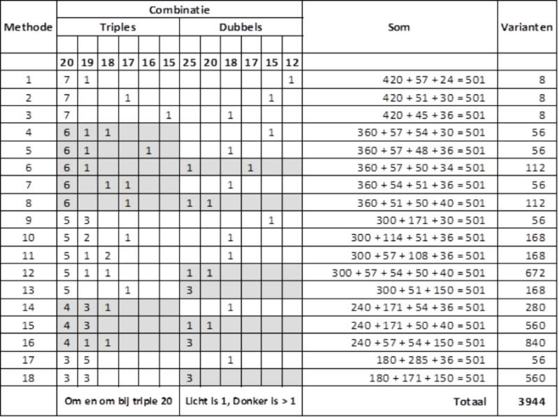 Dat zijn dus 3944 mogelijkheden om zo snel mogelijk van 501 naar 0 te geraken.