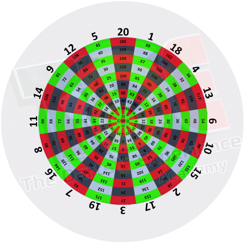 Als darter zal je te maken hebben met optellen , aftrekken , vermenigvuldigen en combinaties van beiden. Hier in ons voorbeeld zie je de verdelingen en scores van de verschillende segmenten op het dartbord.